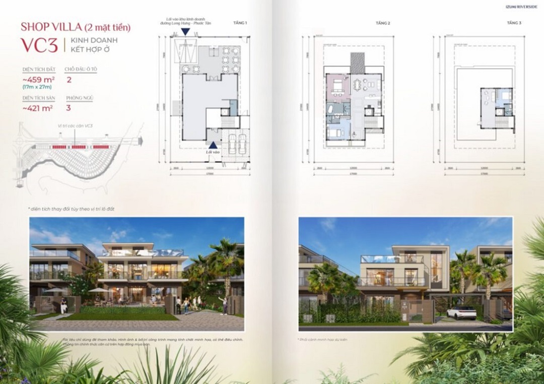 – Shop villa có hai mặt tiền và diện tích đất 459 m2. Mỗi ngôi nhà cao ba tầng và có ba phòng ngủ, với tổng diện tích sàn 421 m2..